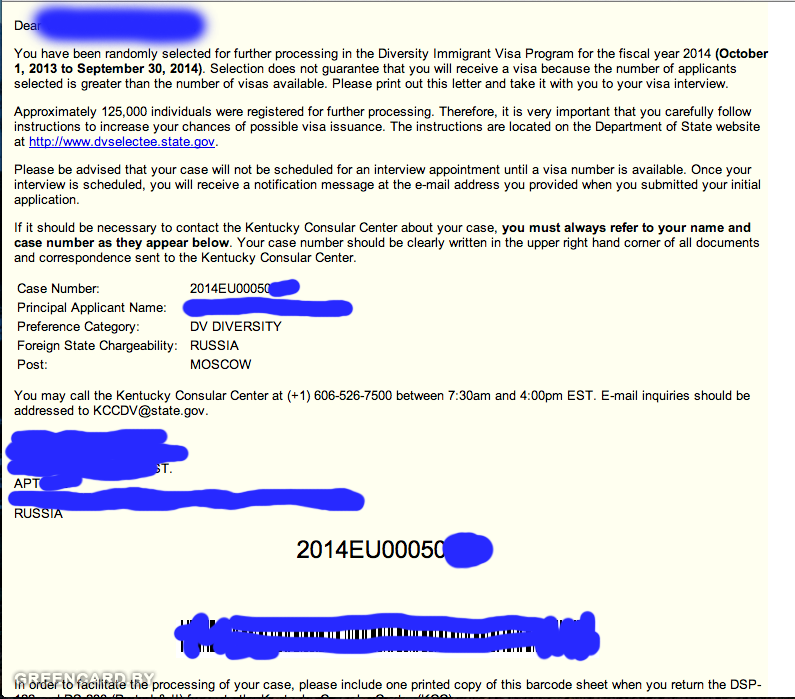 Вы были случайным образом выбраны для дальнейшей обработки в программе Визы для иммигрантов разных за финансовый год 2014 (1 октября 2013 года по 30 сентября 2014 года ) . Выбор не гарантирует, что вы получите визу, потому что число претендентов, выбранных больше, чем количество виз доступной. Пожалуйста, распечатайте это письмо и взять его с собой на ваш визового собеседования.